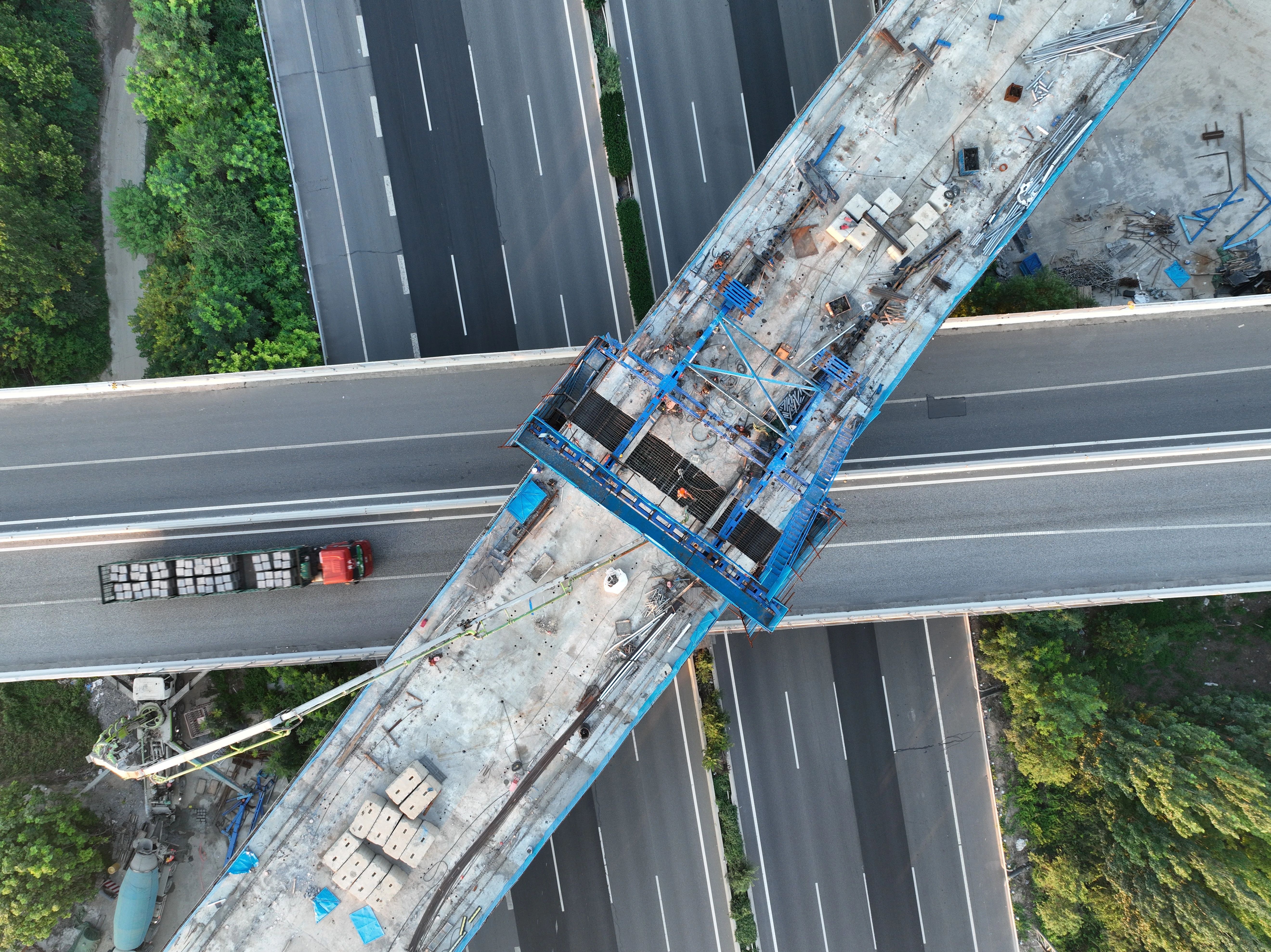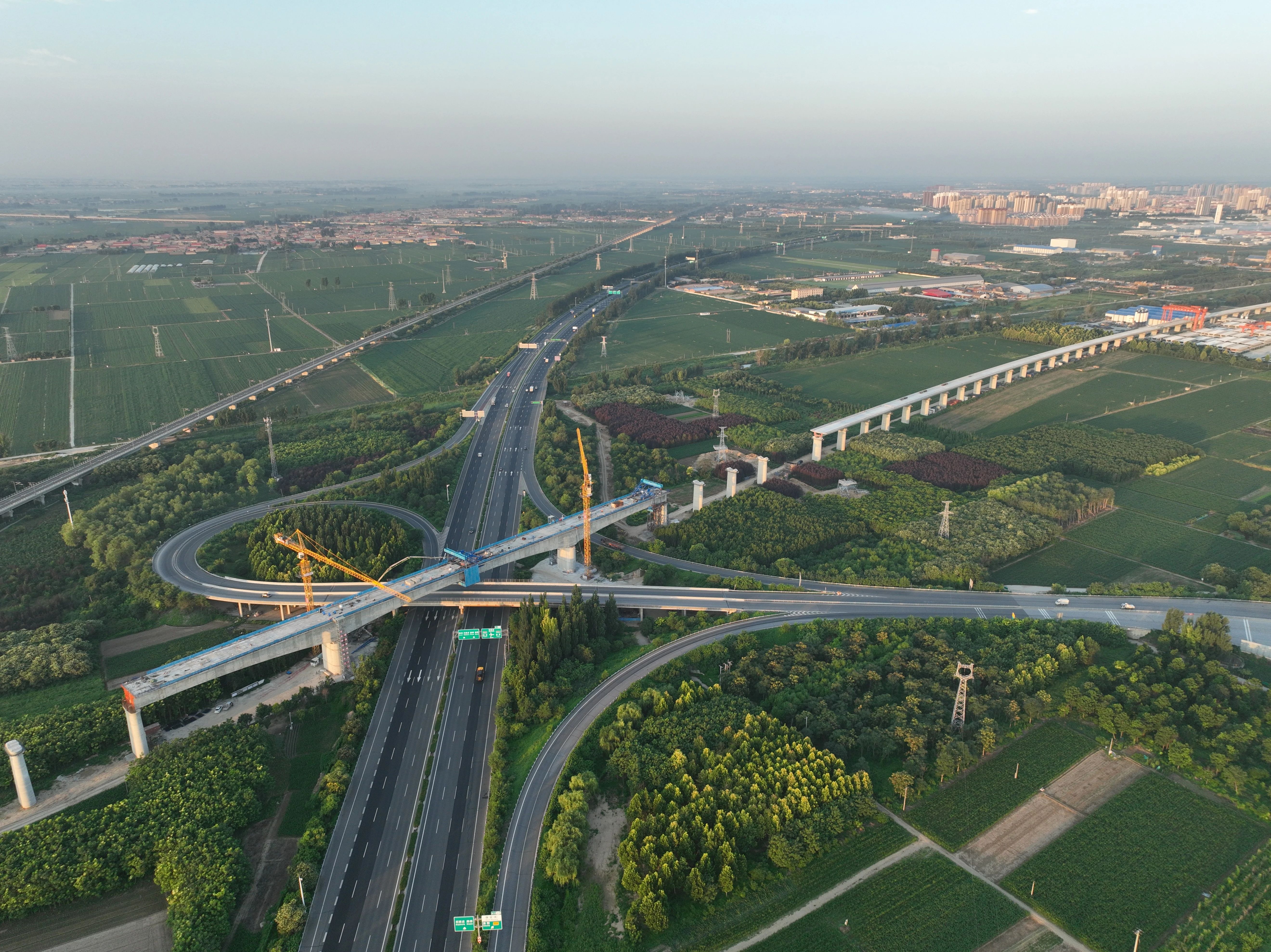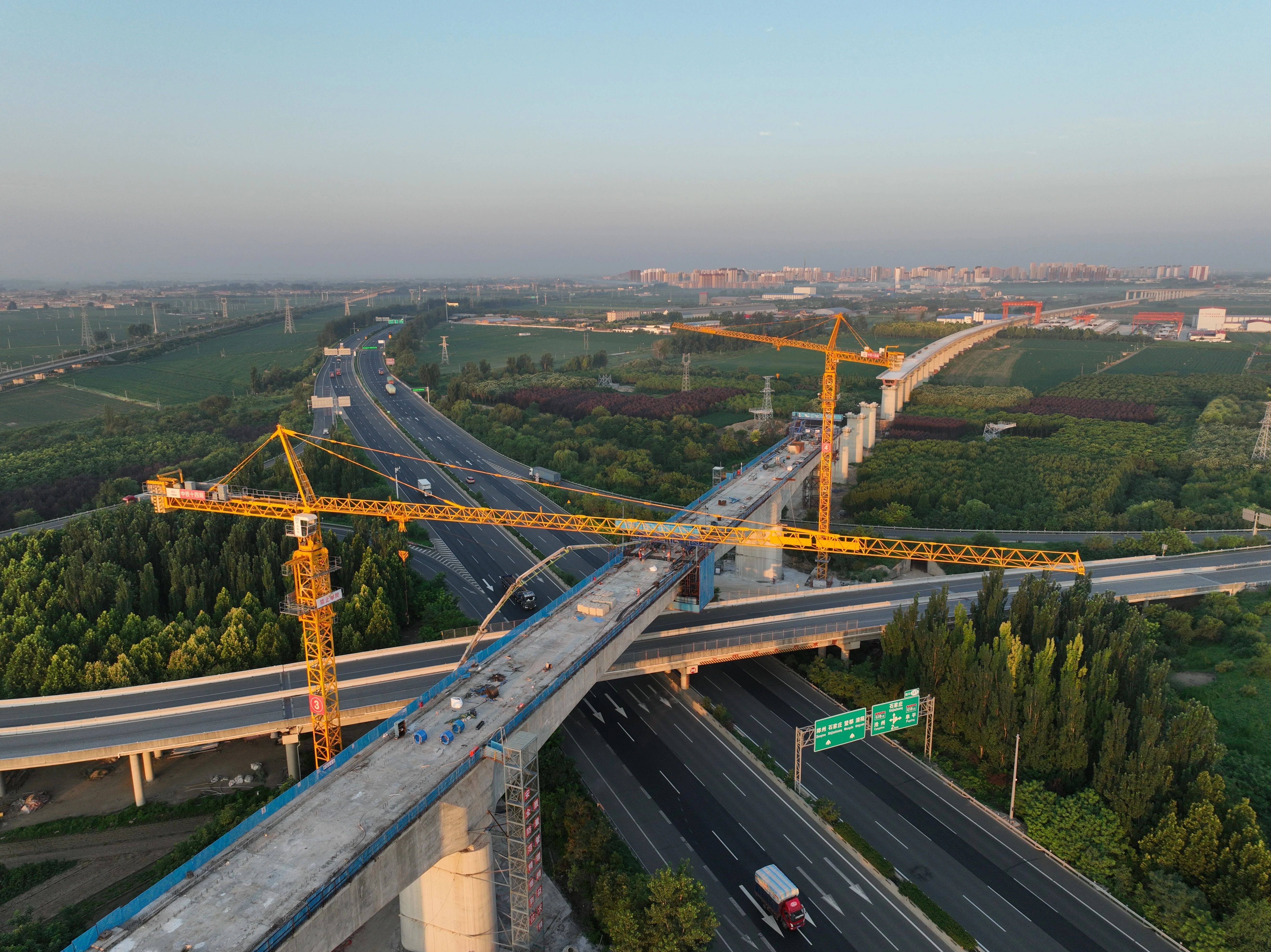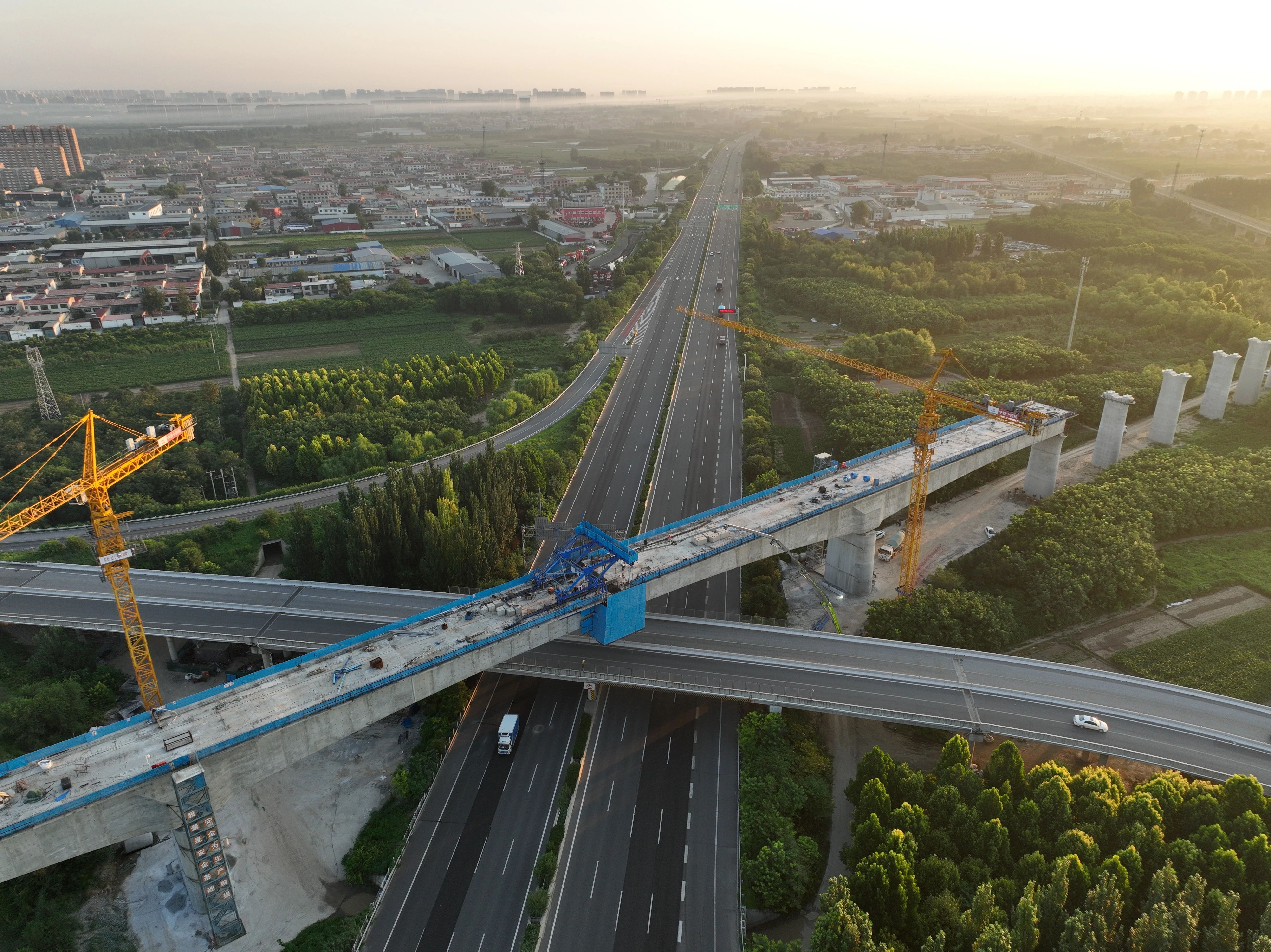 ↑ 7月18日拍攝的雄忻高鐵保定東特大橋跨京港澳高速連續(xù)梁中跨施工現(xiàn)場(chǎng)(無(wú)人機(jī)照片)。